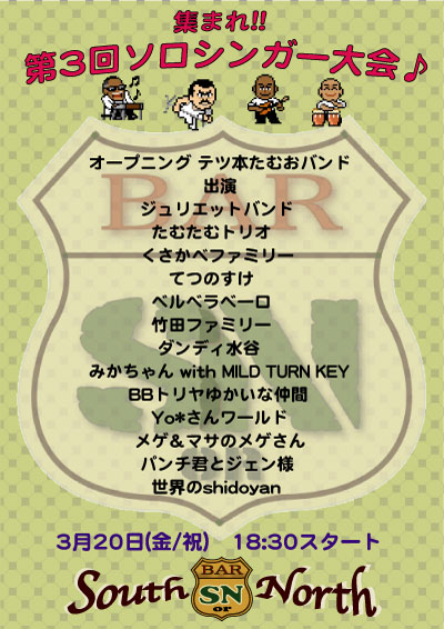 3/20(金)、Bar South or Northにて 第3回ソロシンガー大会がにぎにぎしく開催されました~。