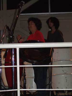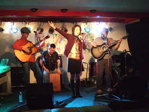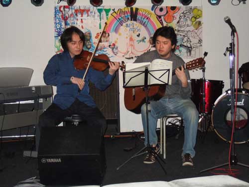 おなじみ、「ひろぼうし」。shidoyanさん(向かって左)も音符のマーカーつけてます(ちっさくて見えないけど)。リーダーs-hiroさん(右)、ギターの弦が切れるアクシデントにも負けず! たむやんさん、しっかり支えるカホンの音色。