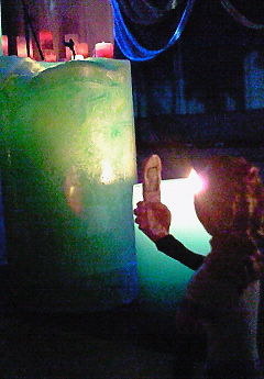 ジュスカの人形、銀色メタリックな布を敷いてみたら、あまりにギラギラで。