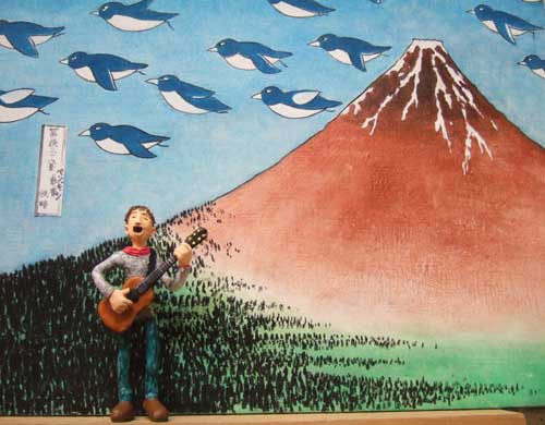「どこでもギターくん」、松島佳世さんの作品の前で歌う。