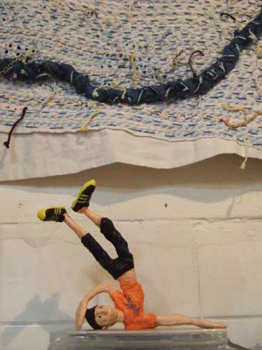 「どこでも逆立ちくん」、ハラミイシカズコさんの作品(一部)の前で逆立ち。