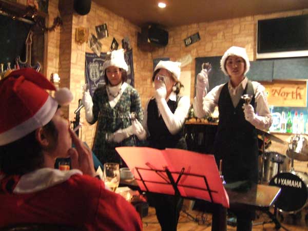 HIROKOさん、ママ、ジュリちゃんのハンドベル演奏。なんだかエラそうなサンタが見守ってます(笑)。この後トナカイも参加、HIROKOさんピアノ伴奏の曲もありました。こないだちょっと練習参加したけど、面白かったなあ~。