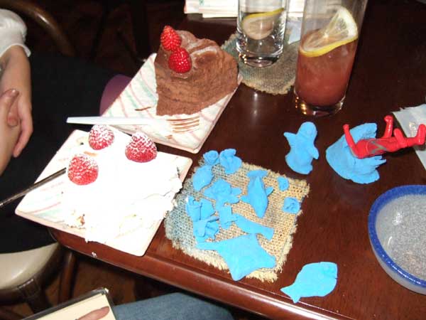 プレゼント交換で紙粘土ゲットした人がいて、早速開けてました。そこで突然粘土教室(?)。海のもの作ってたら、ウルトラマンがかわいそうなことになってたりして(まっちょこ作)。