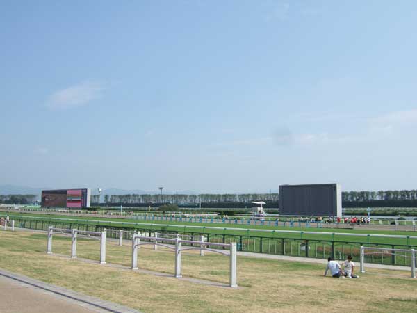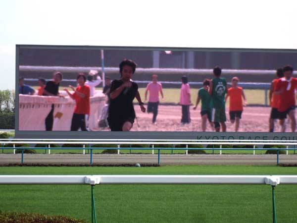 足元は深い砂地、そりゃーお馬さんが走る用ですもんねー。すごい広いし。ほとんど人間は豆粒。モニターで追い越し追い越され、などが大写しされると、どよよ~っとどよめきが起こります。北京オリンピックもかくやとばかり ←言いすぎ
