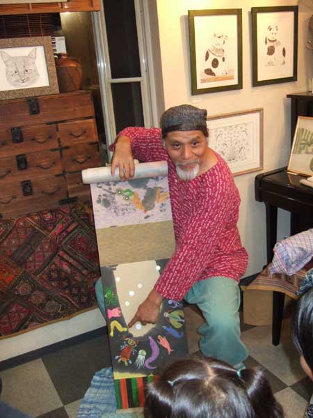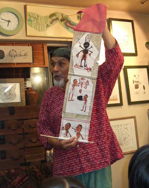 インド・西ベンガル州の言葉で「絵巻物」を意味する「ポト」。それを使って語る「ポトゥア(語り部)」の東野健一さん。