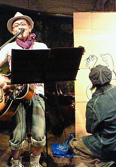 「YUKADO」のステージ。(ゆうたろう 門 秀彦) ギター弾き語りの隣で、段ボールのキャンバスにクレヨンで描かれる絵。歌の内容が、絵を見ている心の動きにリンクする瞬間があったりして、面白かったです。