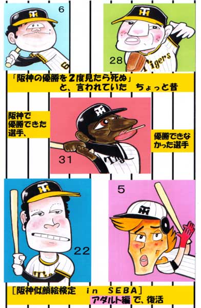 6月に谷町6丁目「セバ」にて開催した、「阪神似顔絵検定」の続編、今回は昔阪神で活躍していた選手の特集。懐かしい顔ぶれがいっぱい!なアタ゛ルト編だそうです。