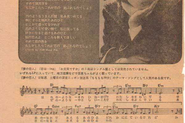 「夢の恋人」は、夫が大事に取っていたすっかり色あせた切抜き(多分「近代映画」から)を見て、伴奏を自分なりに作って弾きました。全然知らない曲なので大変だったけど、