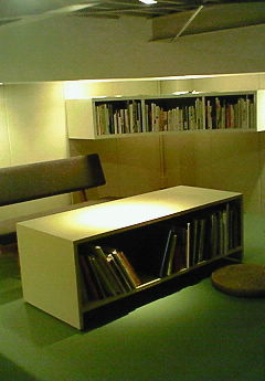 展示方法はプロジェクターで壁に投影したり、換気扇型の壁掛けCDプレイヤーで音を流したり。ヘッドホンで聞いてるスタイルはCDショップの試聴のよう。