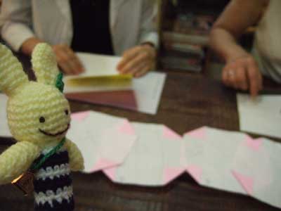 この「福山ローズ」の折り方はインターネットや折り紙の本などにも紹介されてますが、なかなか一人では難しいです。イーハには「福山ローズ折り方達人」の域に達した人がぞろっといますので、折り方教えてもらえますよ♪