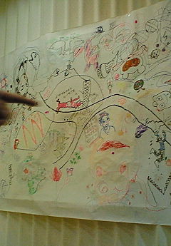 テーブルの上に模造紙を広げて、一体何が始まるのかと思っていたら、「みなさんで好きなように絵を描いてください」