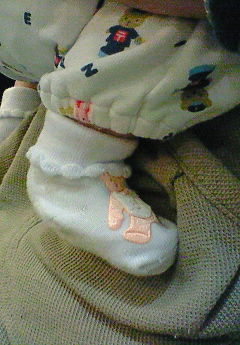 豊橋のハゲさんのライブの時にジェントリーで買ったお土産をやっと渡せました。猫のガラガラと、くまさんのアップリケのついた靴下。早速履かせてくれました。可愛いあんよ(^O^)