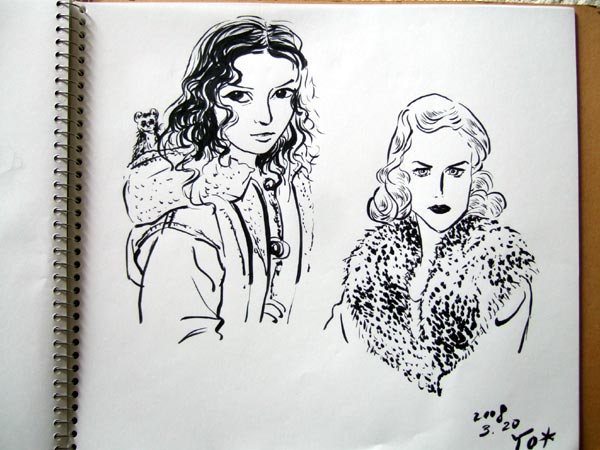 黒髪を筆ペンで塗っていくのや金髪線のちゃかちゃかって、昔マンガ絵描いてた時によくやってたな~。あーなんか思い出す、この感覚。筆ペンのしなりと、きゅっきゅっと紙をこする音も。懐かしい~。すっかりハマって夢中になってたら