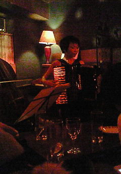 アコーディオンがあんな官能的な楽器とは知らなんだ。情熱的なタンゴを奏でる蛇腹を操る腕の動き、座っている姿勢の傾け方、すべてがまるで舞踏のよう。しかもここあちこち鏡張りだから、首筋から背中にかけての美しいラインがいろんな角度から見える。お店の怪しい赤い光の中に浮かび上がる姿にうっとりと魅入られてしまいました。