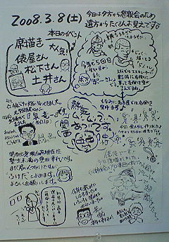 懇親会も楽しかった♪毎年参加させてもらってるけど、今年は「金メダル」という、裏技的にも一応作品を出しているし。このスタンスが結構心地よかったりして。絵日記にもちょっと落書きを。しかしみなさん、うますぎ!