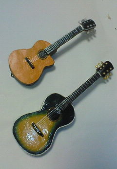 そしてギター。こちらもなんだかんだでもう何本目?ちょっとわからないとこは前に作ったたーぼーさんのギターを参考にしたりして。 前よりも形や厚さがいい感じに作れたみたいです。弦の線描きもがんばりました♪ (画像上・たーぼーさんのギター 下・ハゲさんのギター)