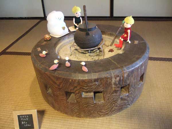 昔お米をついていた水車の部品を使った火鉢。アンティークですね。