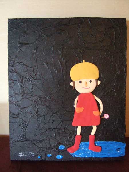 うーん、どうもちまちましすぎ。こないだコラージュの時も思ったけど、ほんと、イメージを形にするのは難しい。でも、なんとかこのスペースの中に世界を作りたいとがんばって、思うようにならないはがゆさはあれど、それもまた楽しかったです。