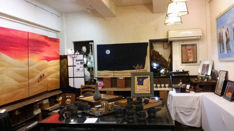 サハラ砂漠などの砂を絵の具に絵を描いている北村瑞枝さんと、鳥取の陶芸家の山本佳靖さんの作品展示中です。