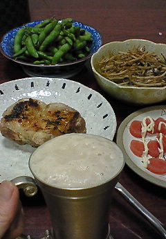 「和音の薫(わいんのかおり)」という焼酎をロックで。ボルドーワインを醸造したオーク樽を使ってるのでその香がします。色も琥珀色。珍しいんでつい買ってしまいました。