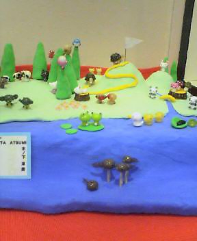 写真は、ウサギとカメのお話をトンボ玉でジオラマにしたもの。携帯ストラップにつける小さなガラスの動物がとっても可愛い♪ すぐ横の壁に、ずらっとクマやらウサギやらアヒルやら雪だるまの天使やら、いろんなストラップがかけてあって、買うのに迷うほど。