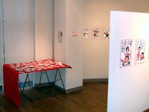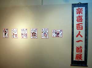 今回の「楽喜百人一首」は、2004年から現在に至るまでの様々な有名人が、似顔絵と百人一首をもじった歌でつづられています。詠み人の名前はもちろん、その背景を読み込んだ歌はかなり手が込んでいて、たとえばゴルフの横峯さくらの絵では当然お父さんも描かれてるんですが、「ファーザー」と声を上げているなど、芸が細かい。うなずかされたり、笑ったりでとても楽しい展示です。