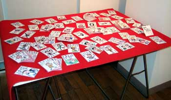 非売品として特別に作られたそうですが、一枚一枚作るの、タイヘンだな~。でもこれで百人一首したら楽しそう!ボーズめくりみたいなのでもいいな。お笑い芸人が出たら芸をするとか、その人のモノマネするとか。