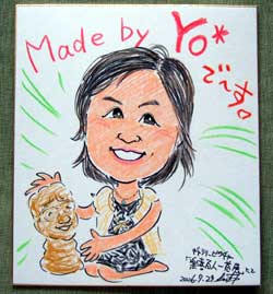 写真ではできない、こういう遊び心が、似顔絵の席描きにはありますね。ユーモアと当意即妙の冴えというか。ちょっと照れくさいですが。余談ですが「描かれなれてる」と言われました。「似顔絵のプロ、ただし描かれるほう」ですか?(笑) 公開もオッケーということで出させていただきました。