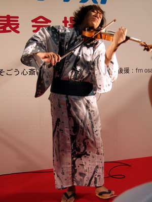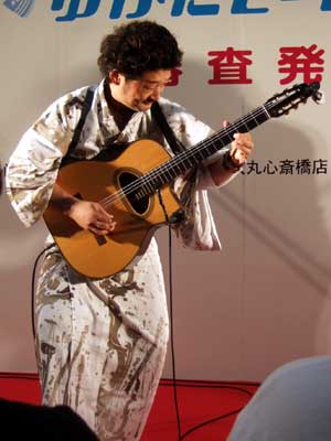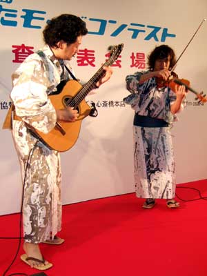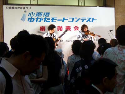 「心斎橋 ゆかたモードコンテスト 審査発表会場」が大丸の心斎橋筋商店街側に設けられていて、人通りの多い中のライブ。ゆかたコンテストの会場と聞いてはいたが、まさかジュスカ本人までゆかたで登場とは思わなんだ。おお~、ニッポンの夏。