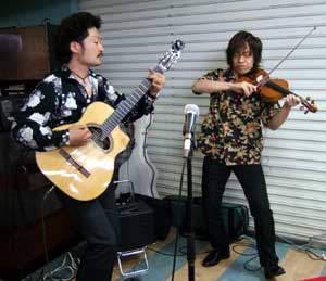 店の内部が入り組んでてライブ場所がわかりづらかった(^_^;)。壁代わりに一部シャッターをおろしてるので、なんか夜のストリートライブのよう。リハの間にぽれぽれさんご夫婦発見♪開始10分くらい前からずっと演奏が続いてたので、なんだか得した感じでした。