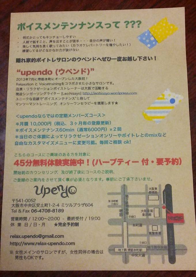 大阪は堺筋本町にあるリラクゼーションとボイストレーニングのコラボサロン「upendo」