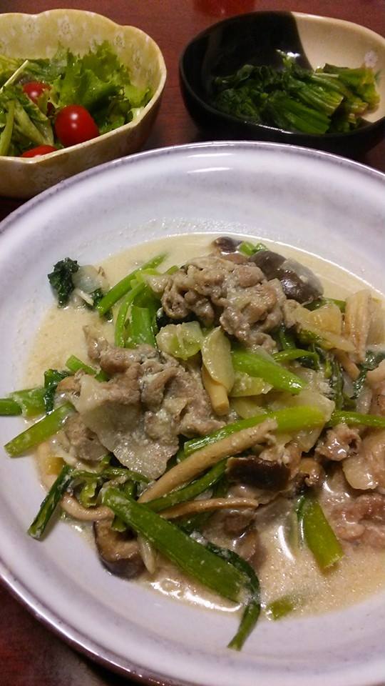 要するに野菜とお肉炒めなんですが、牛乳とゴルゴンゾーラ投入で普段と違うお味。なかなかでしたよ~(*^^)v
