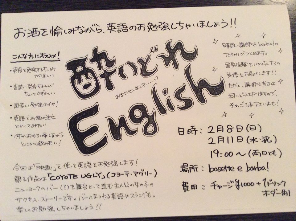 ちなみに2/8(日)の夜は、高槻のバー「バセット・エ・バルバ」で「酔いどれEnglish」というのがありまして。