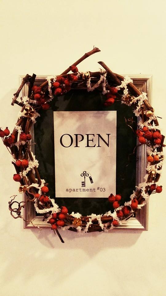 このリースは澤居さんの知り合いのデザイナーの方が、家のバラの実や落ちている枝を使って、ニットを編みこんで作ったのだとか。おしゃれ~(^o^)丿