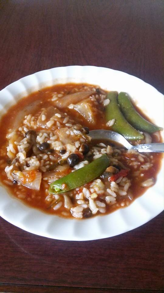前日のトマト煮に、これまた残り物のお野菜と冷ご飯を入れてチーズもたっぷり入れて、リゾット風。
