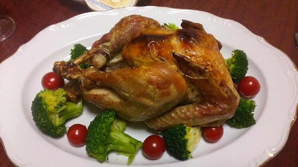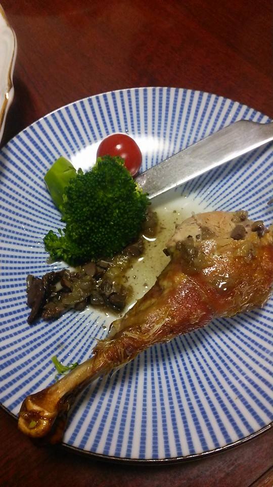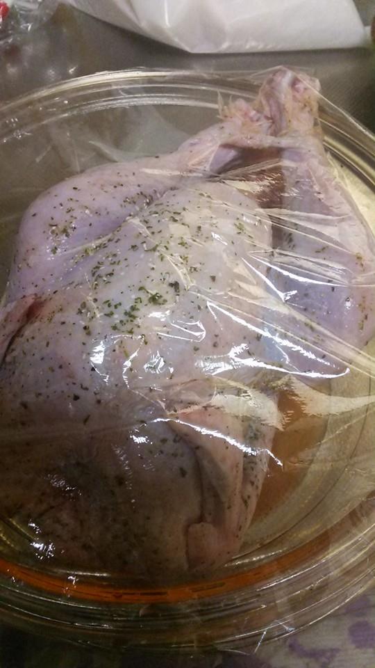 それから表面にオリーブオイル(溶かしバターがいいらしいがめんどくさいw)をぬりぬりして、おなかにセロリちょっと詰めて(詰めなくてもいい)、肉汁が出てたのを少し戻して(乾燥しすぎるかな~と思って)、タコ糸で縛って、クッキングシート敷いてレバーも横に並べて、オーブンで焼く。