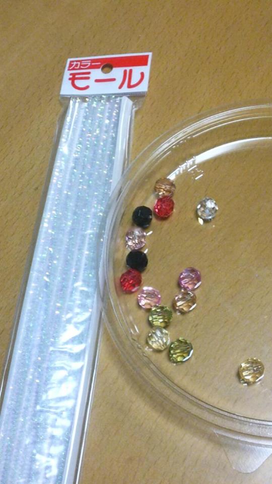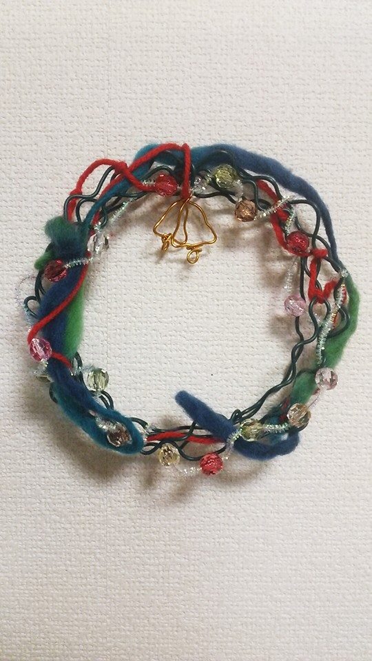 モールとビーズと、パーティのネームタグの毛糸を使って簡単クリスマスリース~♪