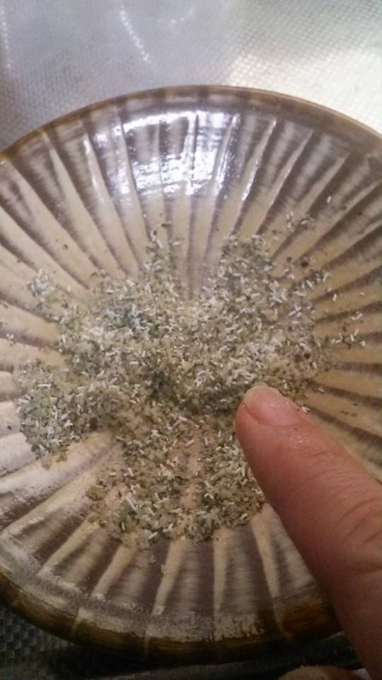 塩、ブラックペッパー、ローリエ、タイム、ナツメグの他に、「スープの塩」というミックス調味料も混ぜて(適当)、表面にすりこみます。