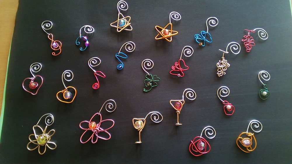 まずはカラーアルミワイヤーとビーズを使ってチャームを作ります。モチーフを2つずつ色違いなどで作って、うずまきグルグルをくっつける。