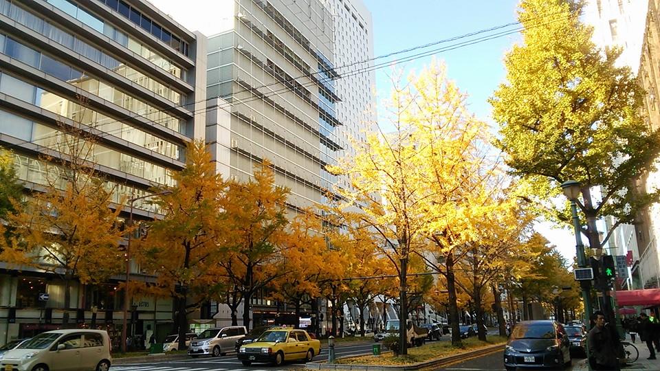 御堂筋の銀杏は黄金色。青い空に映えています。