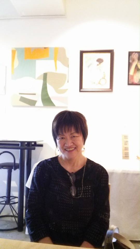 ポンちゃんの作品を見つめる「お母様」しのぶさんと、主催者のかがわきよえさん。