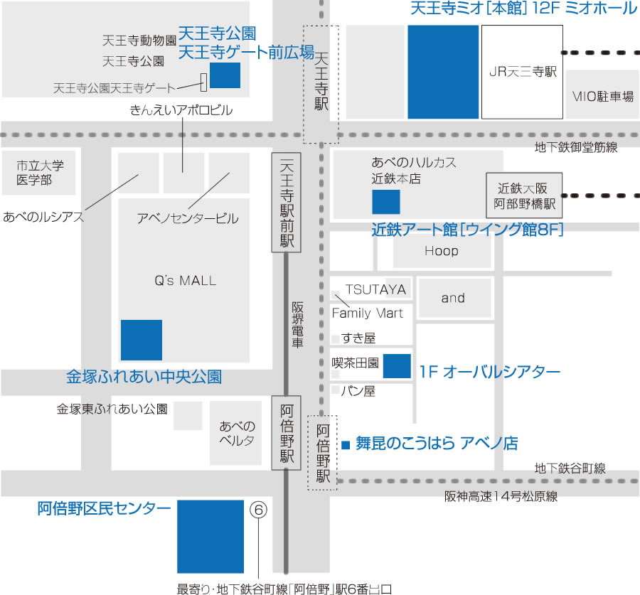 阿倍野区民センター。大ホールで「ズームウーズ」「おうち」「赤いスカートの少年」などの他地下広場でも。