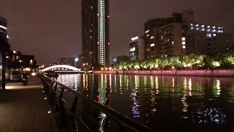 行きの雨も帰りは小雨、傘なしで歩いて駅まで。 水面に映る光が幻想的でした。