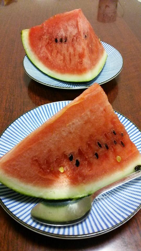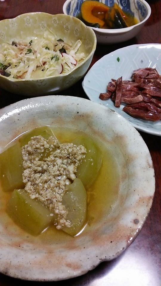 冬瓜の鶏そぼろあんかけ♪ 昨日の残りの南瓜も。そしてデザートは西瓜。