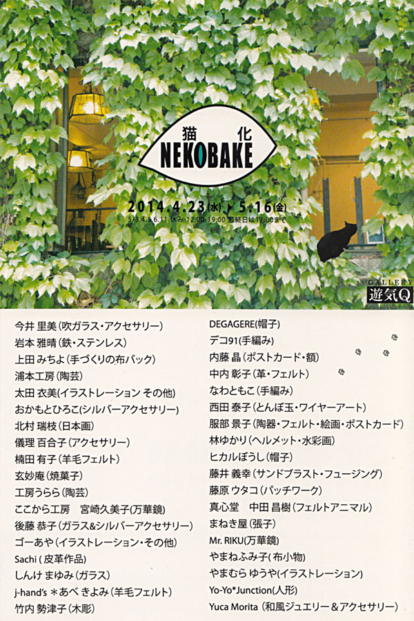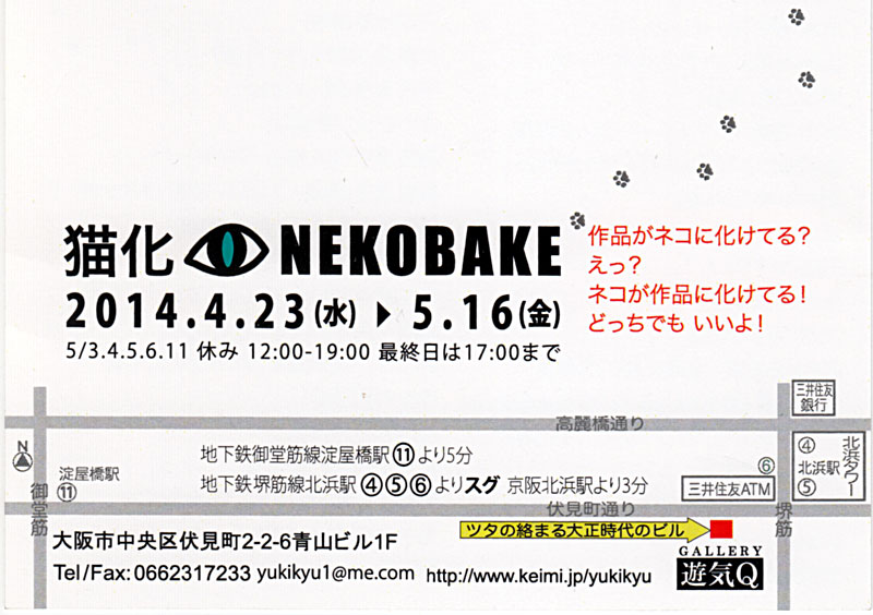 北浜の、ツタのからまる青山ビルの一室、「ギャラリー遊気Q」にて、「猫化」本日スタートしました。