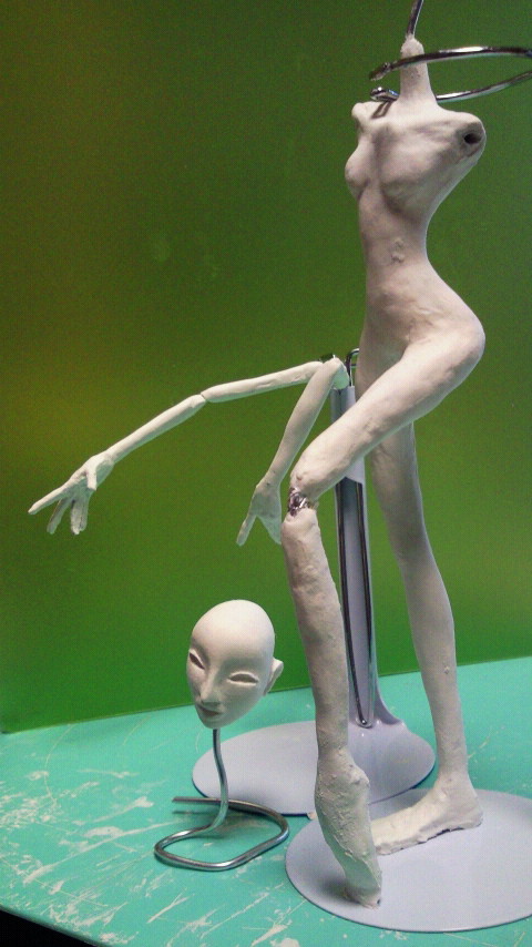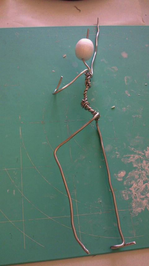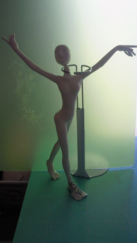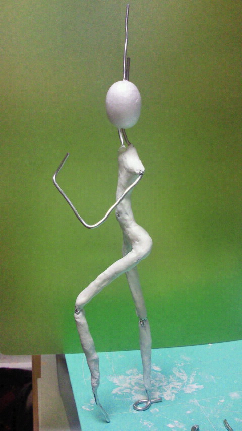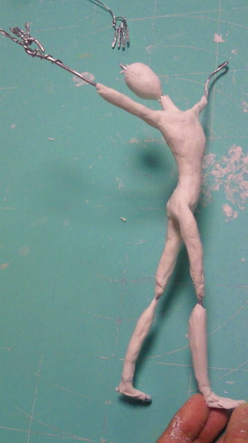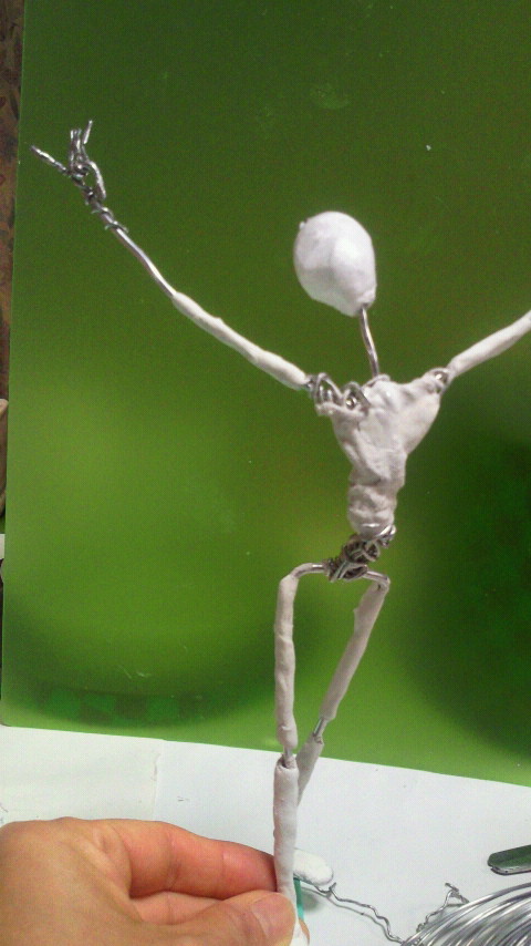 いつも針金芯の状態でバランス取ってしまい、肉付けしたら重心がずれたりしてたので、今回はあまり最初の形にこだわらず、さっさと先に進めています。粘土をざっくりつけているので、左右のバランスや、体つきはこれから調整します。
