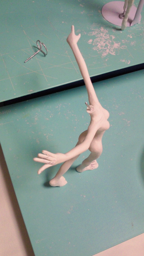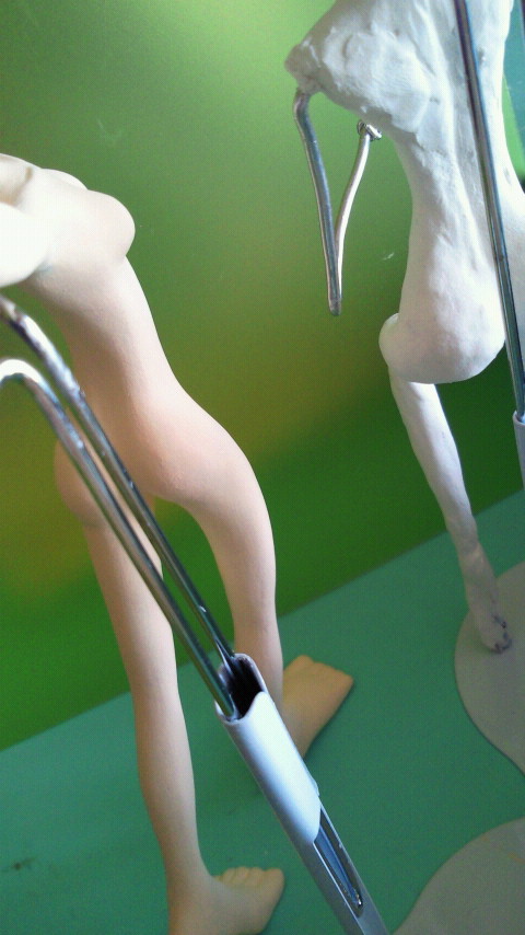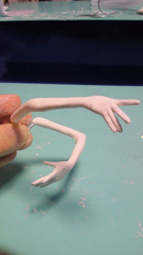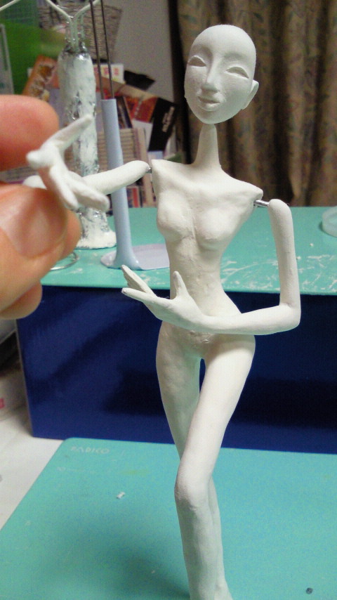 手足を長く、美しい体を作りたい。今までもそう思いながら作ってましたが、たとえば手首を細くしたいと思っても、針金芯が出っ張ってきてるとそれ以上削れない。仕方がないので粘土被せておく、というような妥協もよくしていました。