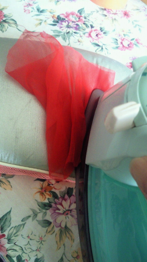 オーガンジーにアイロンでカーブを施すのは、コサージュ作家マーノさんのテクニック。ほんとは丸いコテがいいんでしょうけど。
