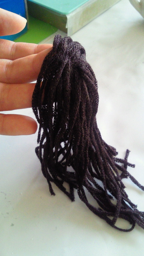 髪の毛は、今までは一本一本頭に糊付けしてましたが、「横浜人形の家」で見た人形の作り方で、市松人形もビスクドールもカツラを作っていたので、真似てみました。