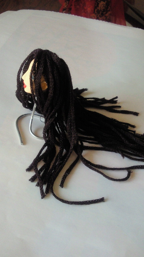 毛糸束ねてるだけですけどね。ちょっと被せてみたのが右の画像。なんかコワイ~(^_^;)。